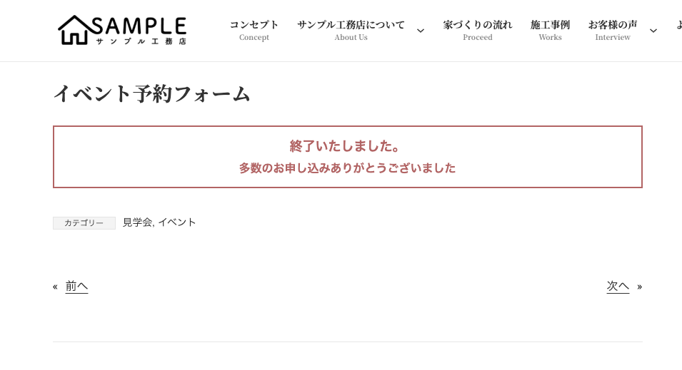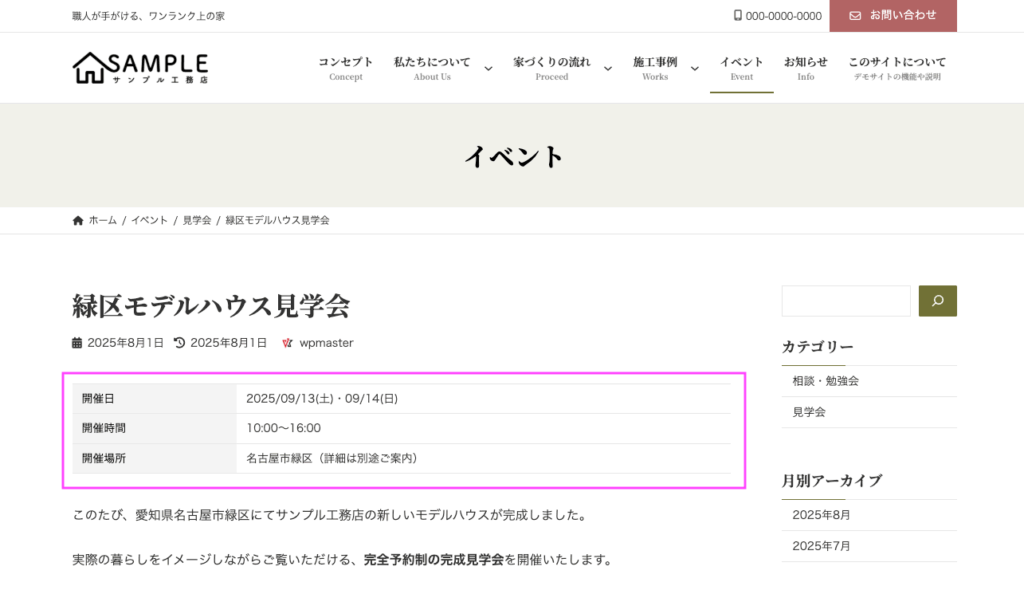 このデモサイトでは、工務店サイトに欠かせない「イベント情報」を効率よく発信・管理できるよう、「イベント」のカスタム投稿タイプを設けて対応しています。